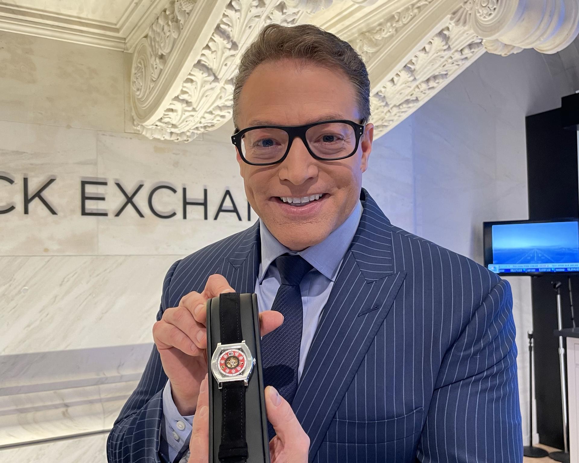 Robert Frank with the $2 million Schumacher F.P. Journe. Credit: Crystal Lau | CNBC |