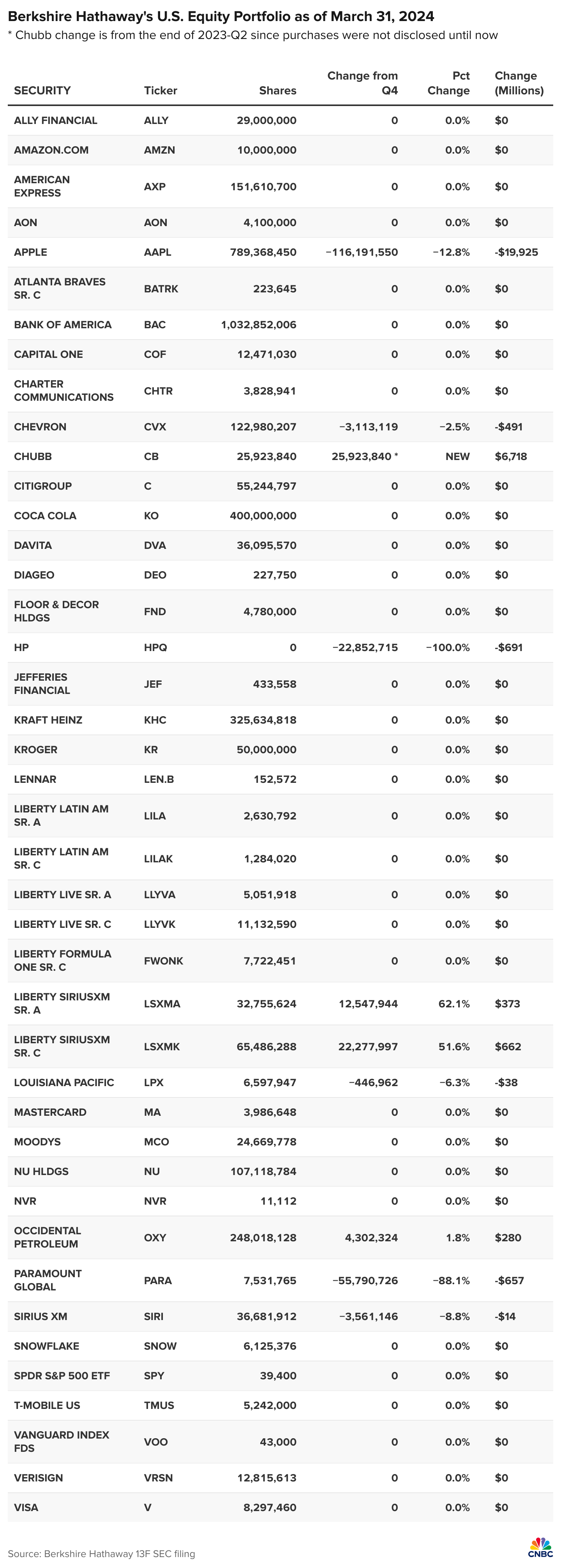 Holdings are as of March 31, 2024 as reported in Berkshire Hathaway’s 13F filing on May 15, 2024, except for: -